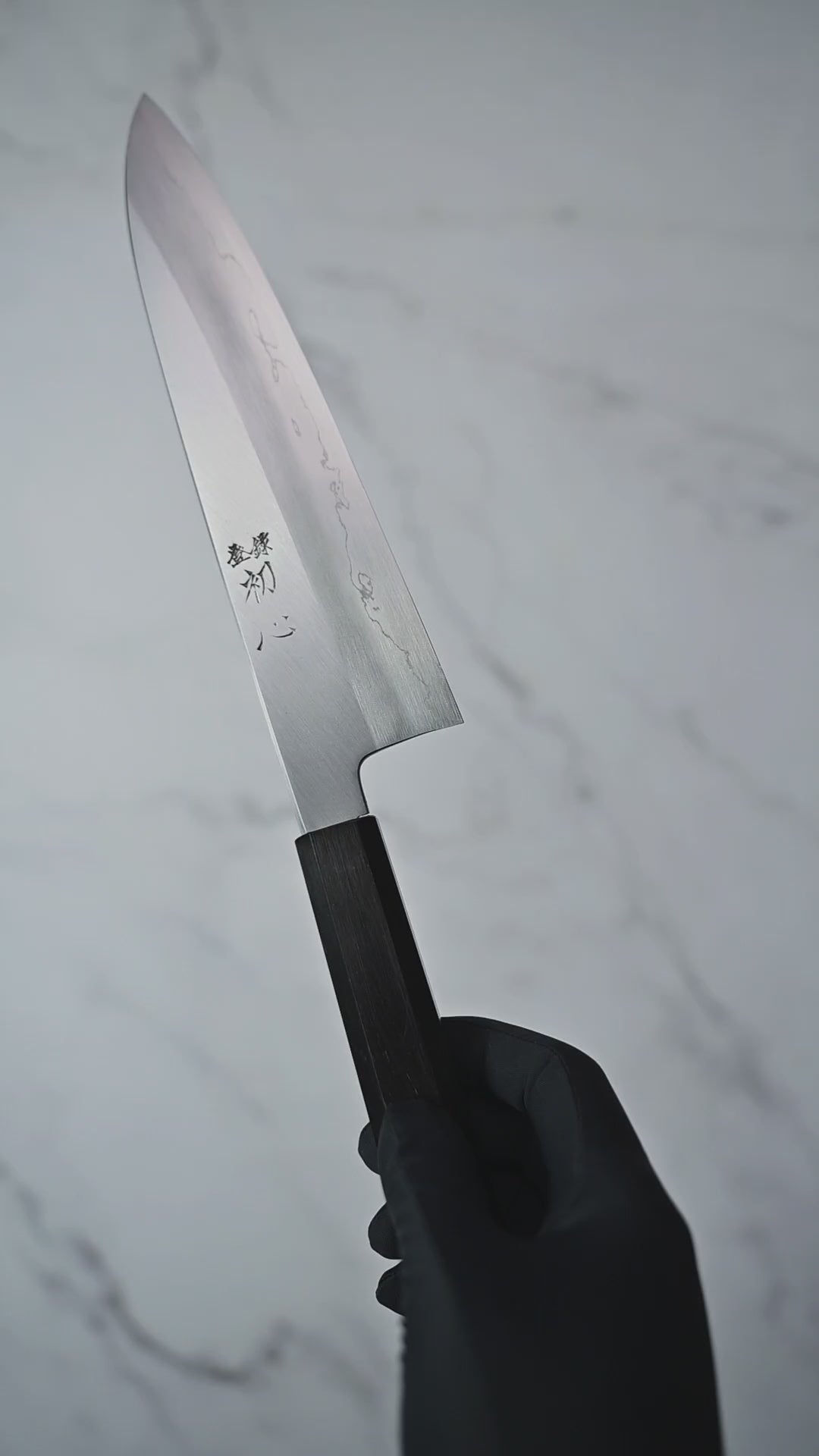 alt="A Japanese chef's knife with a black rectangular handle and a shiny silver blade featuring engraved characters, photographed on a dark gray background. This gyuto knife embodies traditional craftsmanship and modern elegance."