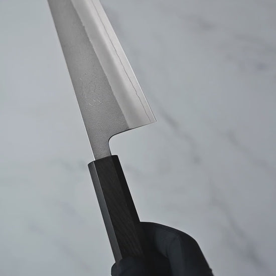 Hand-forged in Sanjo, Japan by Yoshikane hamono, this bunka features an SKD semi-stainless core clad in stainless steel with a nashiji finish. The 166mm edge and 51mm heel height make it versatile for general kitchen tasks, while the reverse tanto tip adds precision for detail work. Built in a workhorse style, it has a thick spine with excellent distal taper, yet remains thin behind the edge—a well-executed grind that allows it to cut smoothly and efficiently. Suitable for both home cooks and professional chefs, and a strong option for those seeking a compact daily driver.