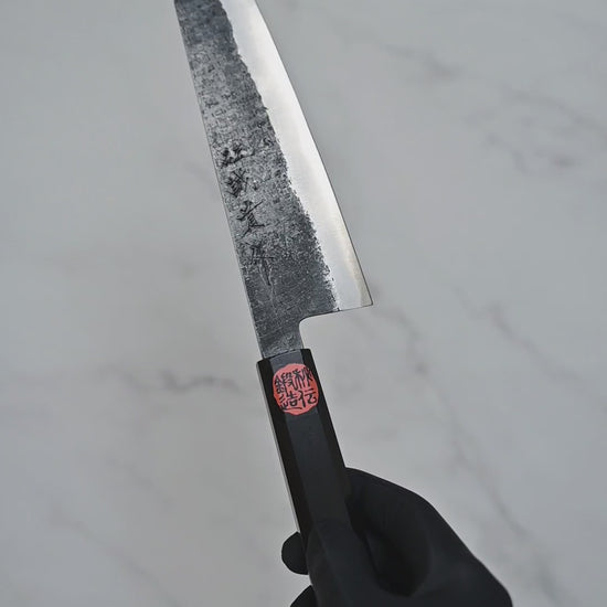 Handforged in Miki, Japan by Shigeki Tanaka, this kiritsuke gyuto features Aogami#2 carbon steel core with stainless cladding and rustic tsuchime kurouchi finish. The 201mm cutting edge with a flat profile offers versatility for slicing and push cutting in compact kitchens. A robust grind with sufficient thinness delivers reliable performance without feeling delicate, making it an approachable workhorse for daily use. Stainless cladding simplifies maintenance. Suitable for beginners, home cooks, and professional chefs.