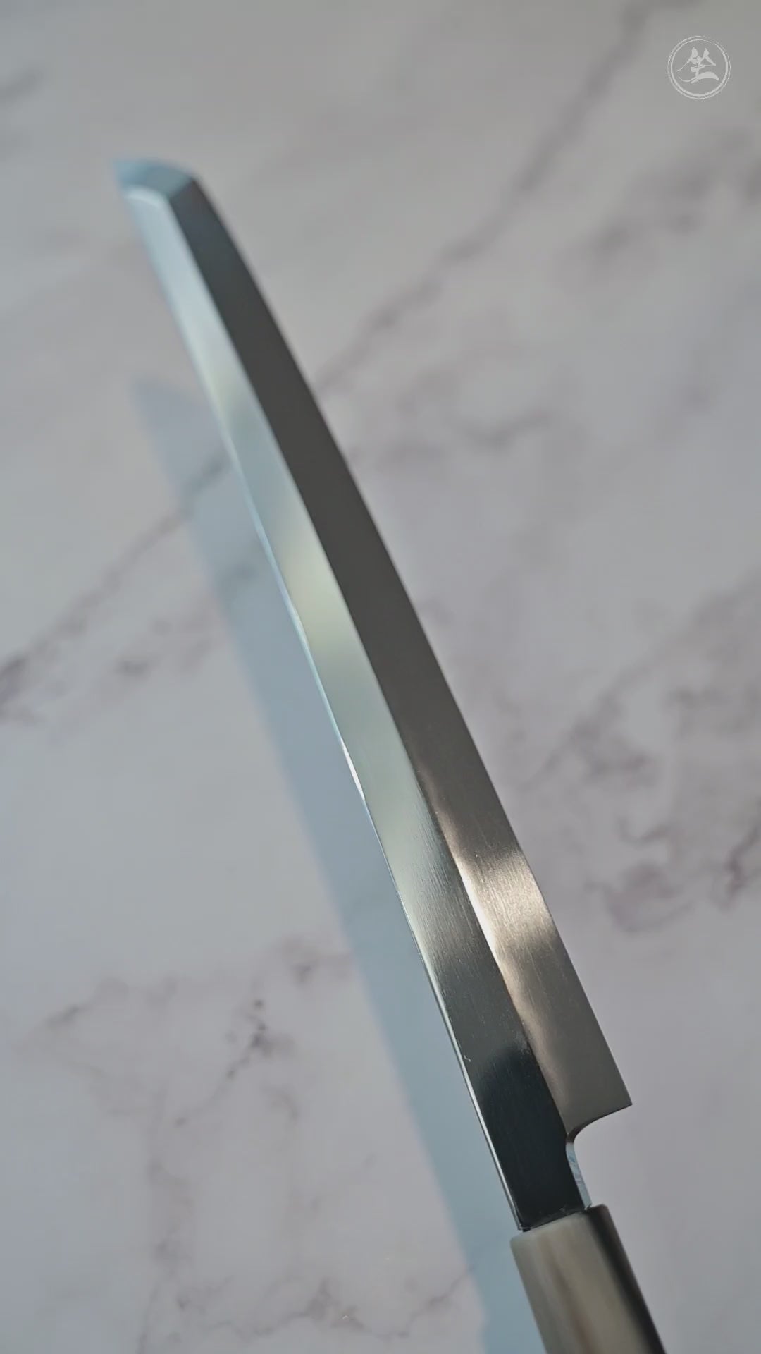 Hand-forged in Sakai, Japan by Yoshikazu Ikeda. This mizu-honyaki (water-quenched honyaki) sakimaru takohiki is crafted from Aogami #1 steel and features a wave hamon. It is finished in full mirror polish on both sides. Designed for professional sushi chefs and honyaki collectors.