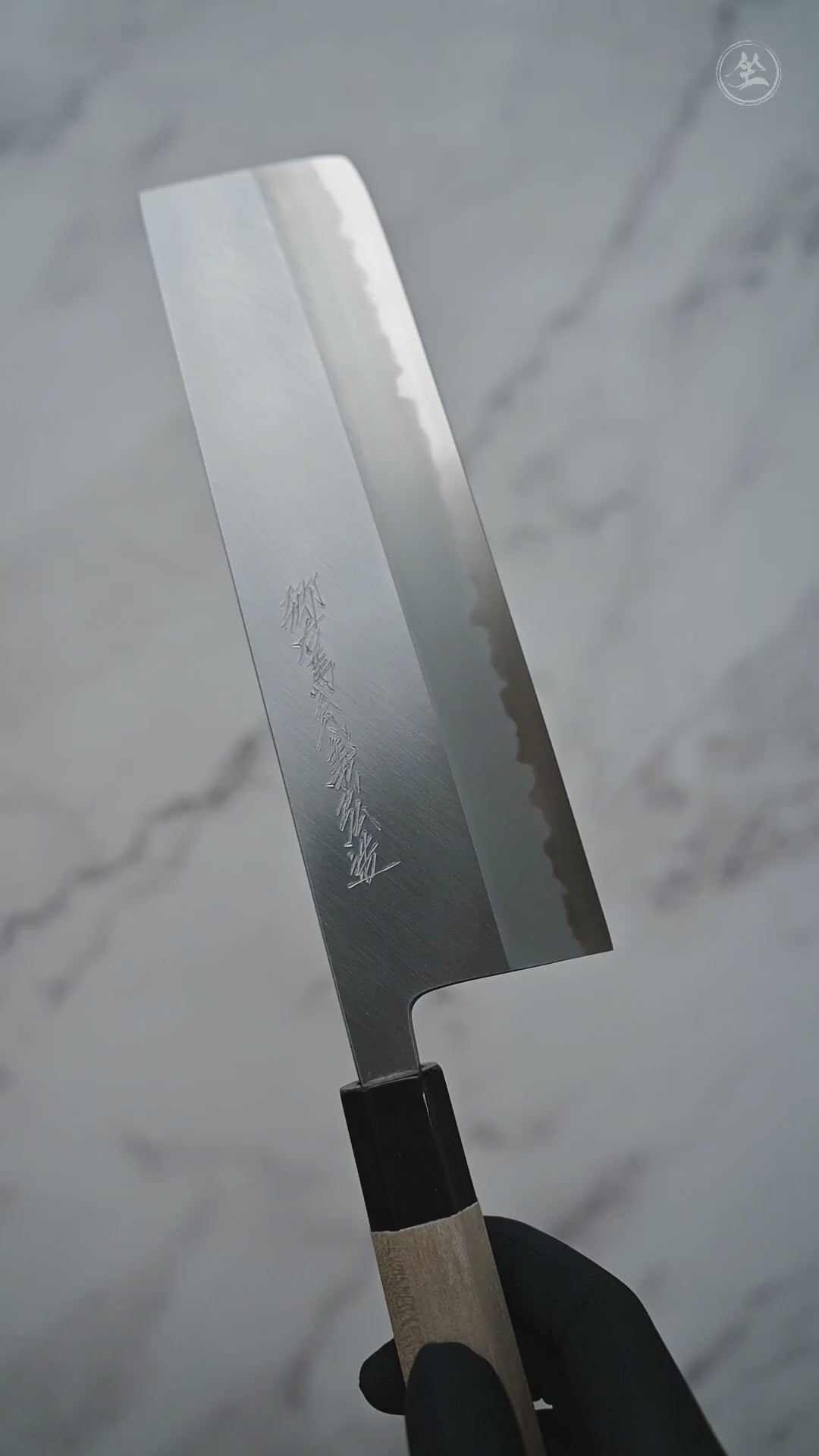alt="Balance point of a Tanaka 210mm nakiri with a migaki finish blade, featuring an engraved marking near the handle. A hand in a black glove holds the knife against a plain grey background."