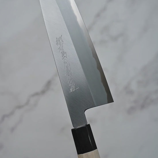 alt="Yoshikazu Tanaka shinogi shirogami#1 tall gyuto 240mm with a wooden handle and a polished, engraved blade rests on a dark, textured surface, showcasing exquisite craftsmanship."